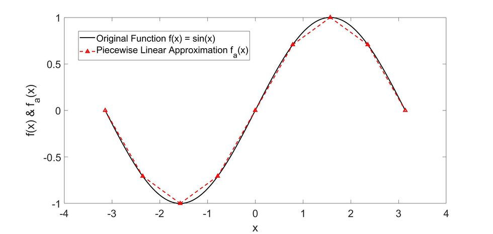 Consider the trigonometric function <math>f(x)=sin(x), -\pi \leq x\leq \pi </math>, as an example. The approximation straight lines are very close to the original function with only 9 sampling points. | Consider the trigonometric function <math>f(x)=sin(x), -\pi \leq x\leq \pi </math>, as an example. The approximation straight lines are very close to the original function with only 9 sampling points. | ||