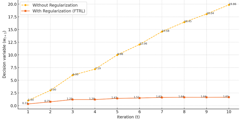 Shows stabilizing effects of FTRL on quadratic loss function by comparing the decision variable updates with the no-regularization case for 10 iterations.